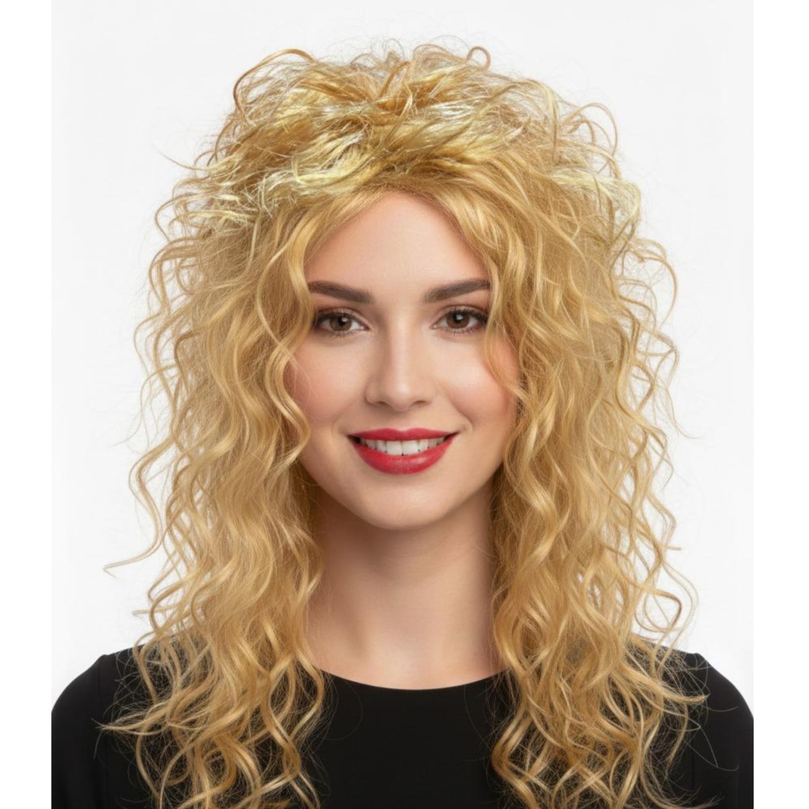 פאה בלונדינית ארוכה מתולתלת עשויה מסיבים סינתטיים עמידים בחום
